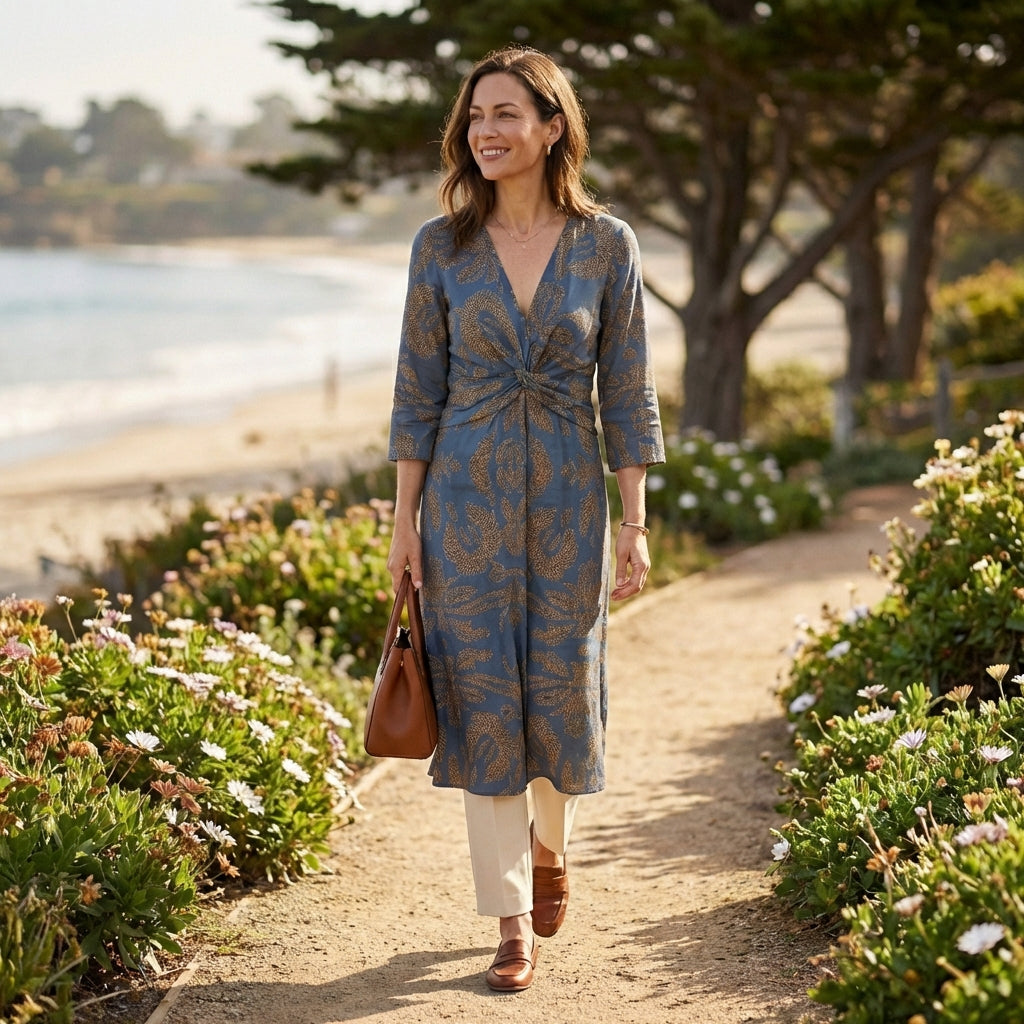 Cette robe fluide à taille nouée pour femme séduit par sa coupe féminine et son imprimé raffiné. Confectionnée dans un tissu léger et agréable à porter, elle offre un tombé naturel qui accompagne les mouvements avec élégance. Son col en V met subtilement le décolleté en valeur, tandis que le lien à la taille permet d’ajuster la silhouette pour un effet harmonieux et structuré.